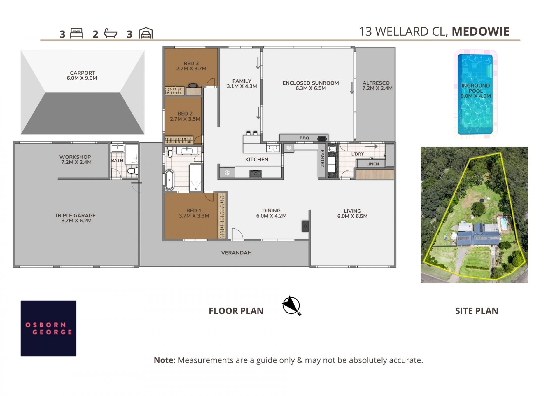 - Three-car garage with extra workshop space, drive-through access, remote-controlled roller doors, and an ensuite that has a shower, toilet, vanity.