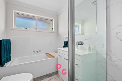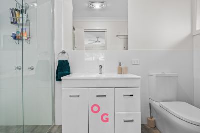 - Main bedroom featuring a large three-door built-in robe and private ensuite with shower, vanity and toilet